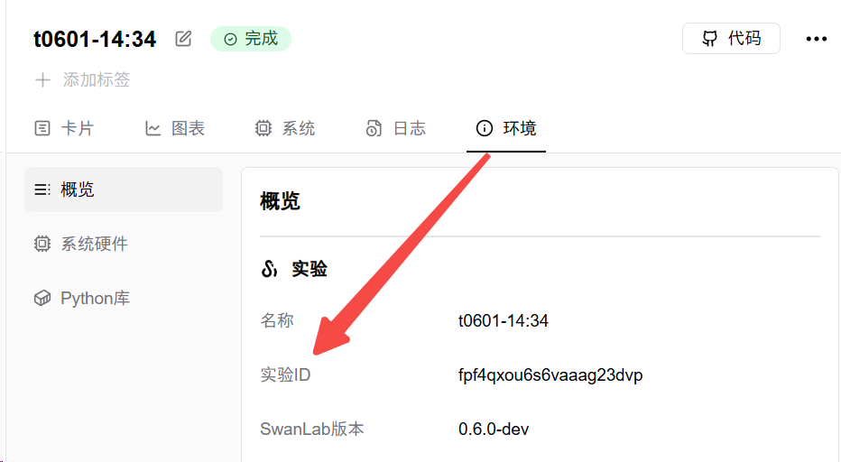 要查看某一个实验的CUID, 可在云端版网页的"环境"标签页查看"实验ID"一行, 点击即可复制此实验的CUID
