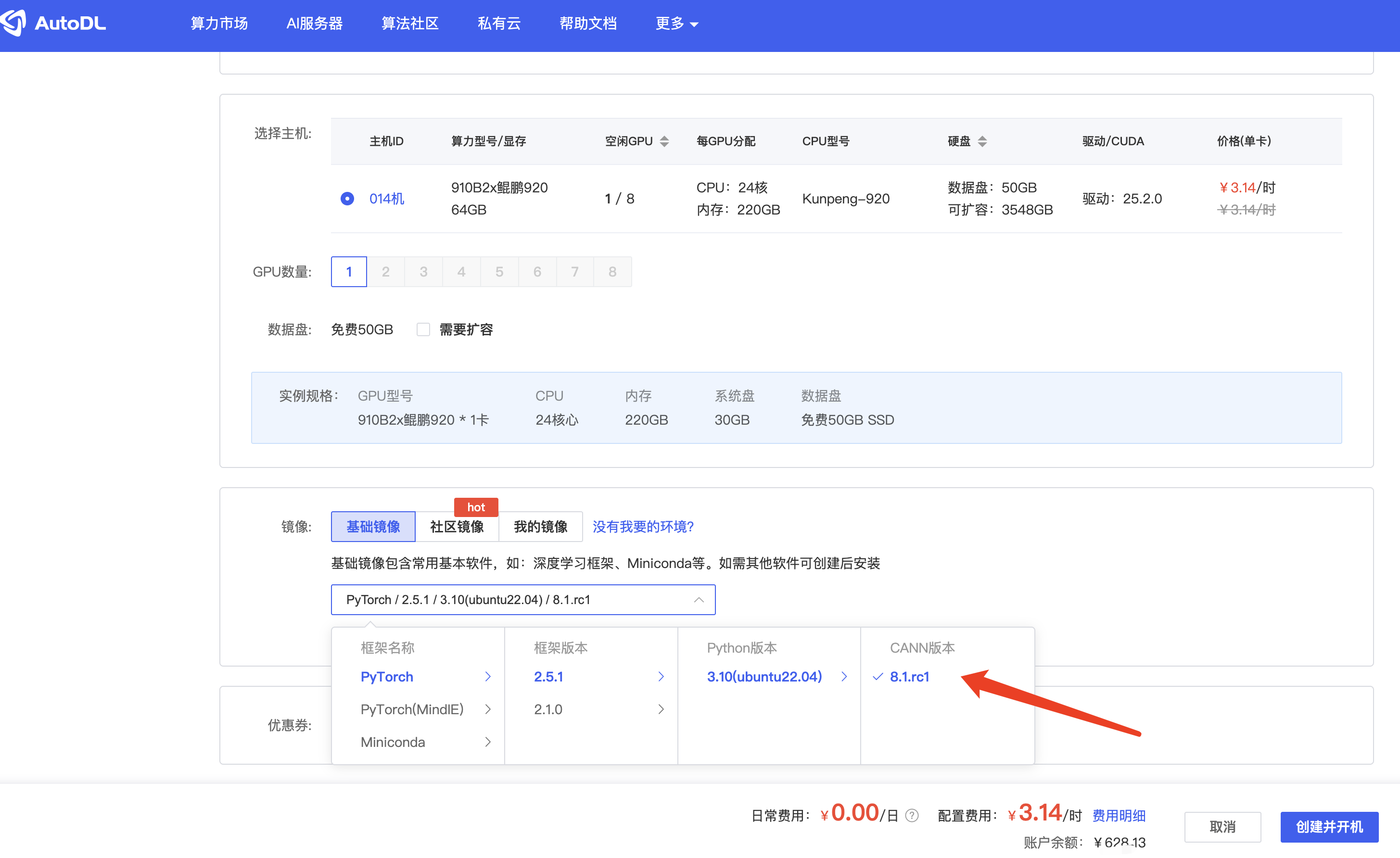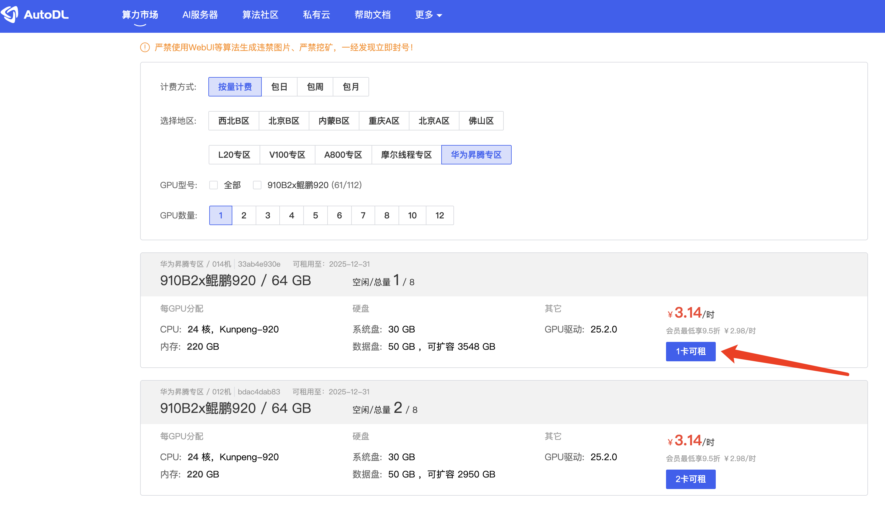这次我们使用AutoDL的NPU昇腾910B2-64GB来进行实验,首先在算力广场,我们选择昇腾专区,卡的数量我们选择一块即可