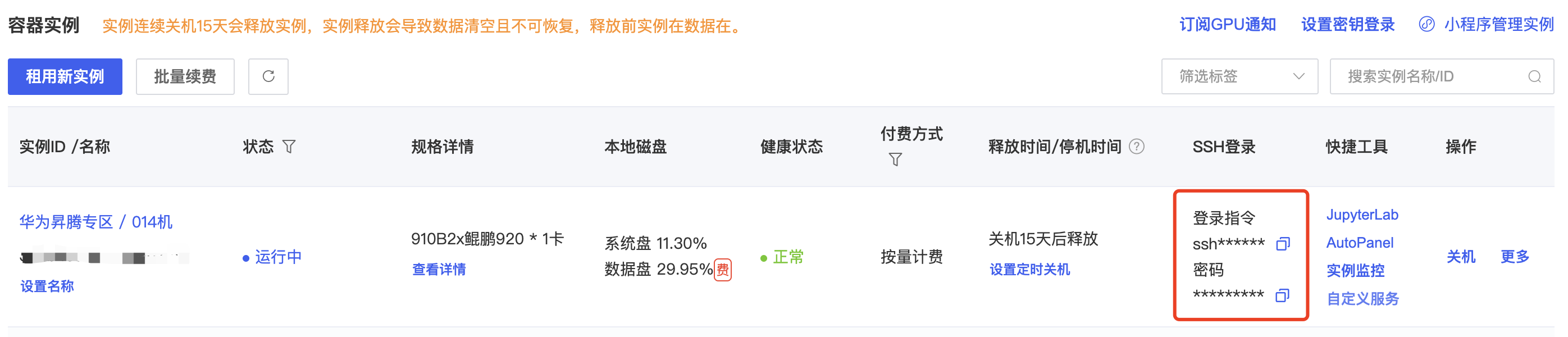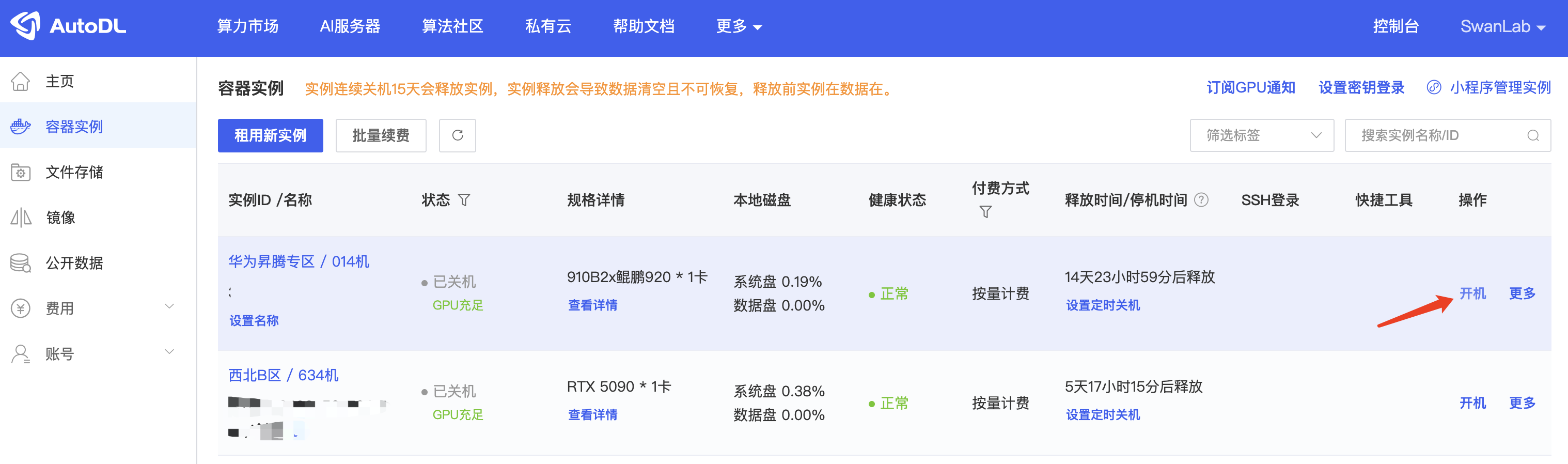 后续我们在本地控制台里选择容器实例,开机就可以直接使用NPU了