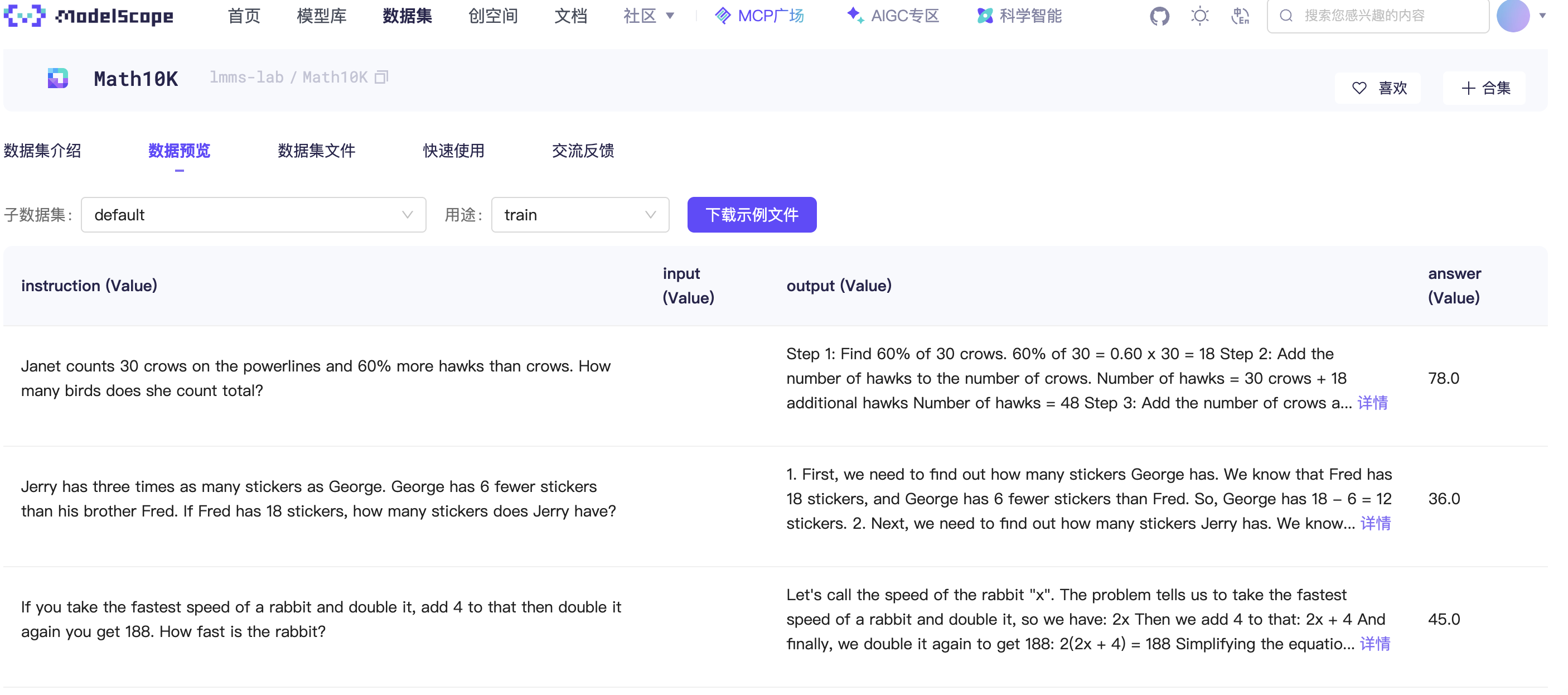 本次教程以实验操作为主,使用一个高质量数学问答数据集作为微调的数据集,可以在魔搭社区上下载,链接如下: