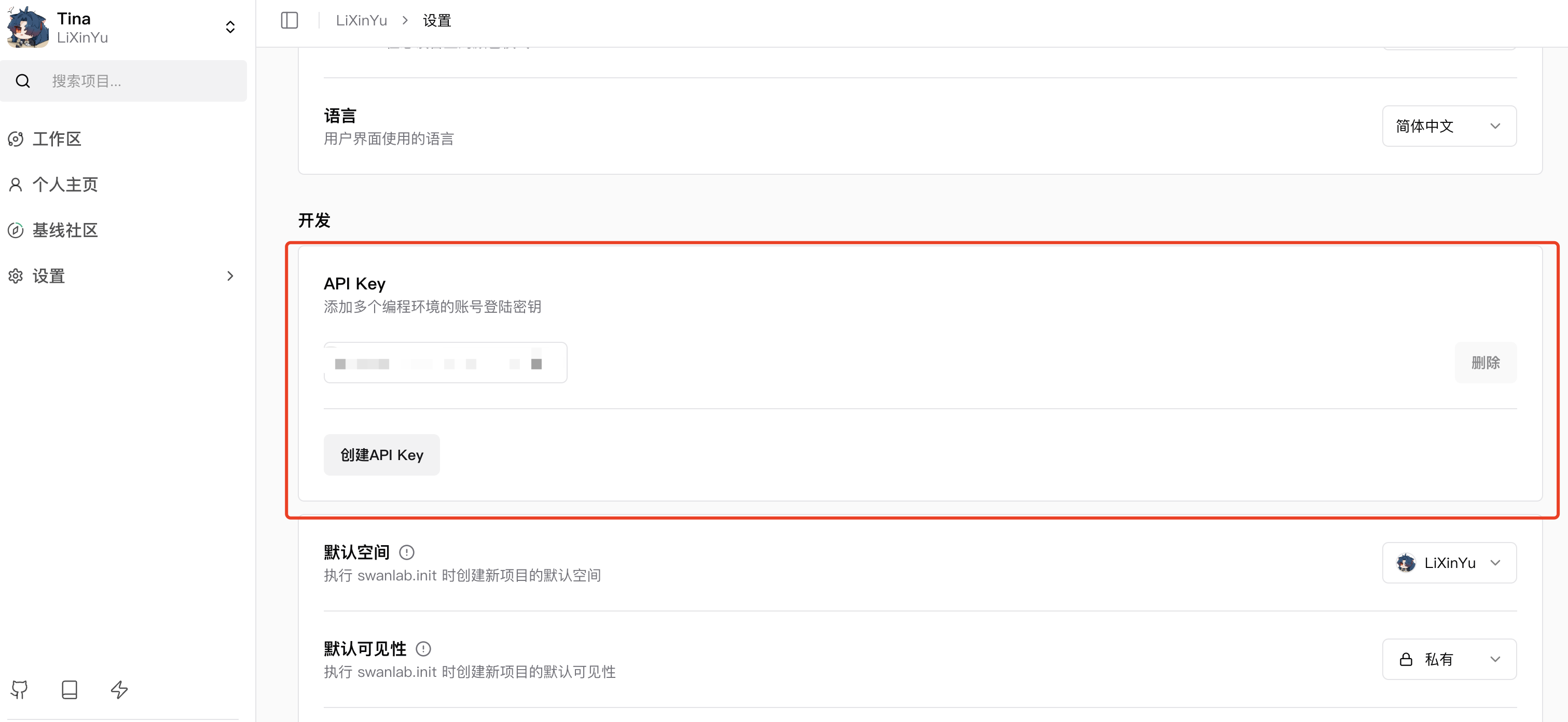 swanlab_run_name: Qwen2-7B第一次登陆SwanLab的话需要设置API Key才能使用,在设置中可以找到: