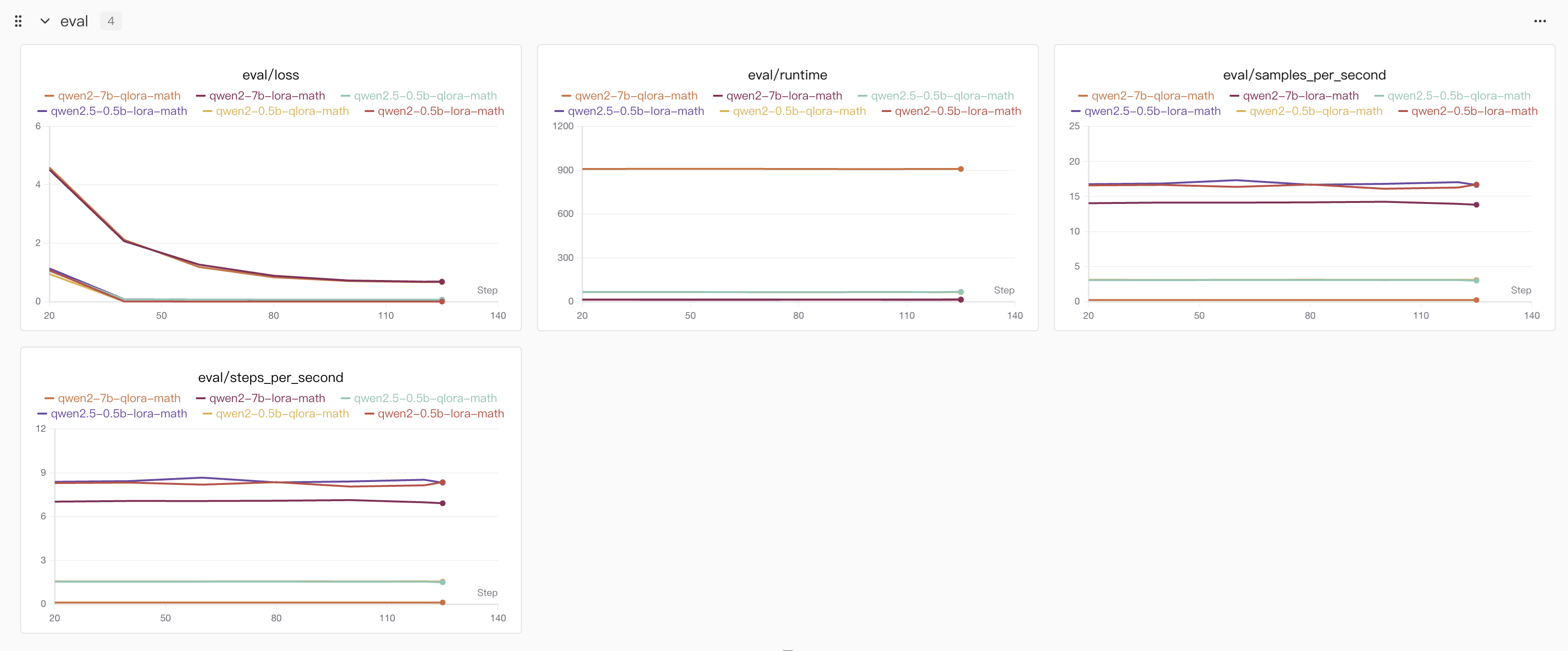 而从训练曲线上看,qlora和lora效果差不多,如果对结果有验证需求的炼丹师可以参考我的另一篇文章,使用evalscope框架来eval的,地址在这👉地址,llamafactory好像把原来的eval功能删了,那这里就不再赘述了。