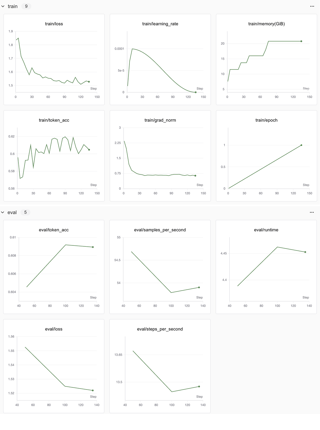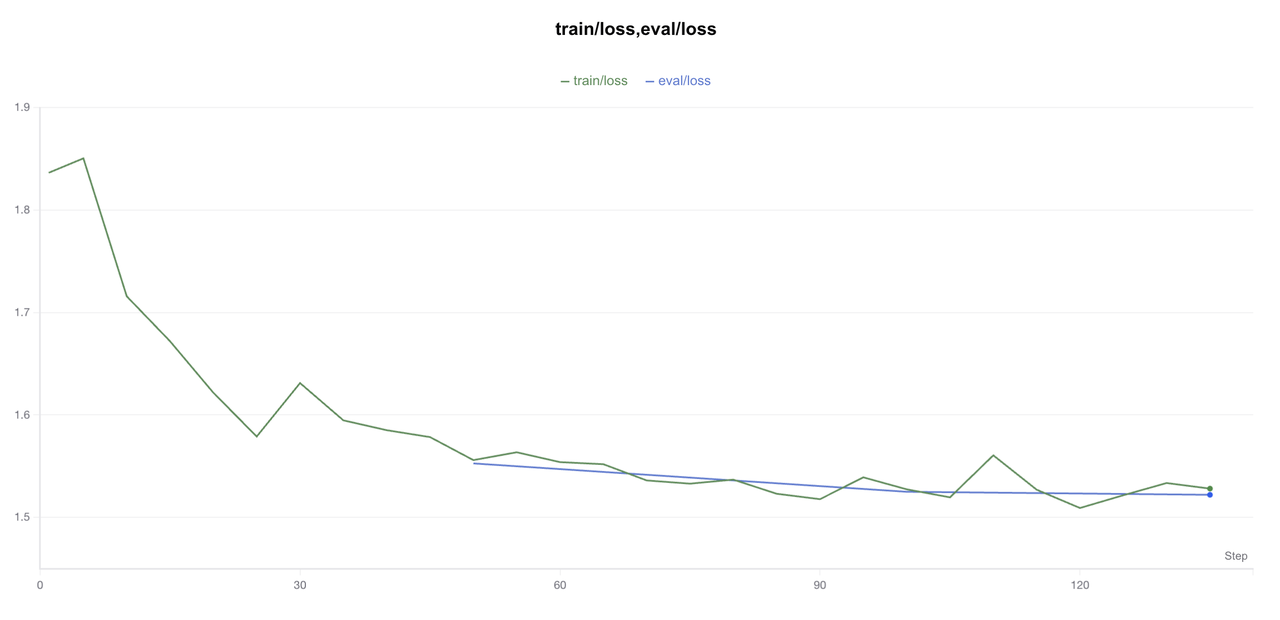 绿色的是train loss,蓝色的是eval loss。可以看到train loss呈现缓慢下降的趋势,如果logging steps足够多,应该会在epoch的交替阶段,阶梯式下降;eval loss呈现正常下降趋势,没有过拟合现象。