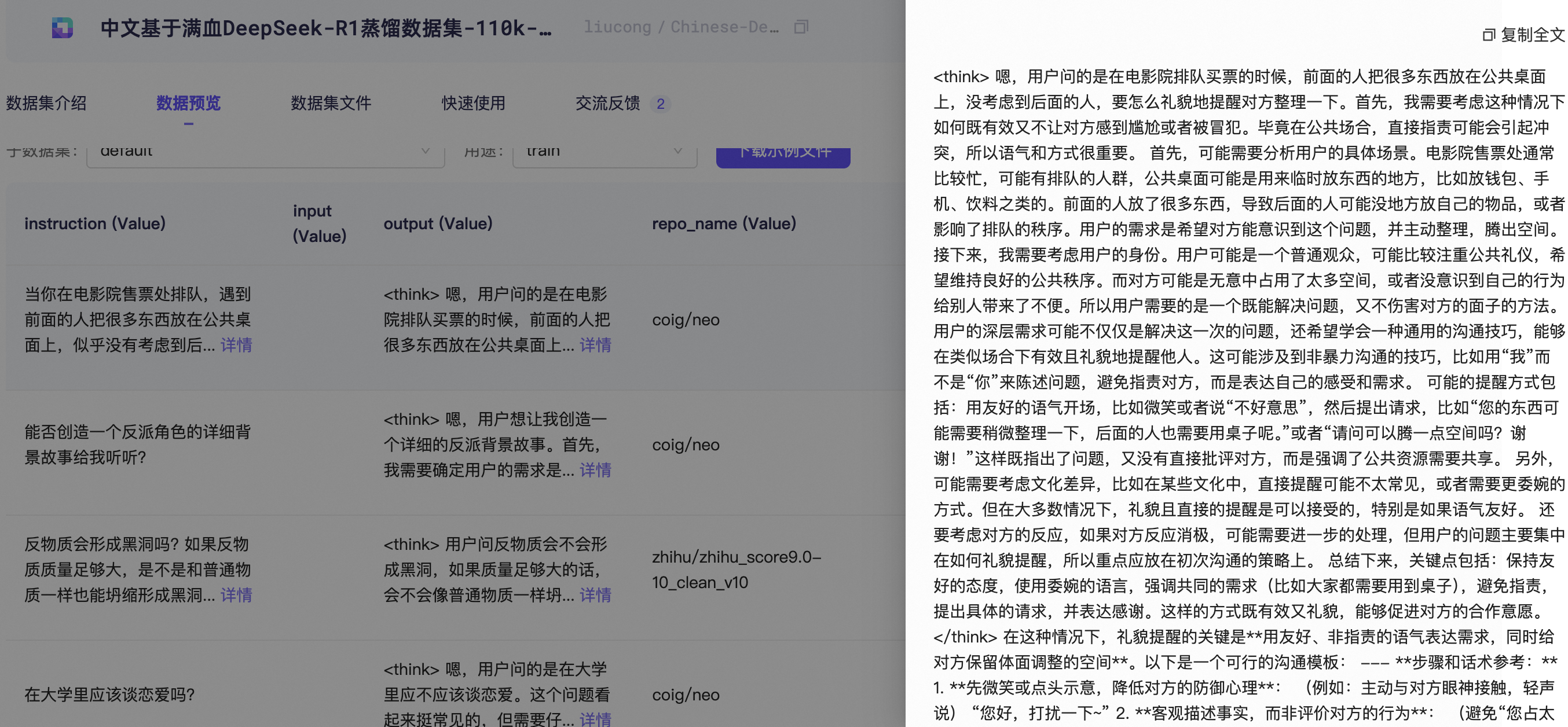 modelscope download --dataset liucong/Chinese-DeepSeek-R1-Distill-data-110k-SFT --local_dir /data/nvme0/zh_cot_110k_sft数据集具体如下所示: