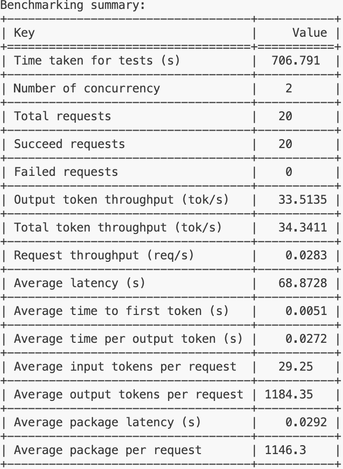 综合来看,这个模型在处理单个请求时的延迟较高,请求吞吐量较低,这可能意味着在当前配置下,模型的性能表现不佳,特别是在需要快速响应的场景中。可能需要对模型进行优化,或者在部署时考虑增加资源以提高性能。