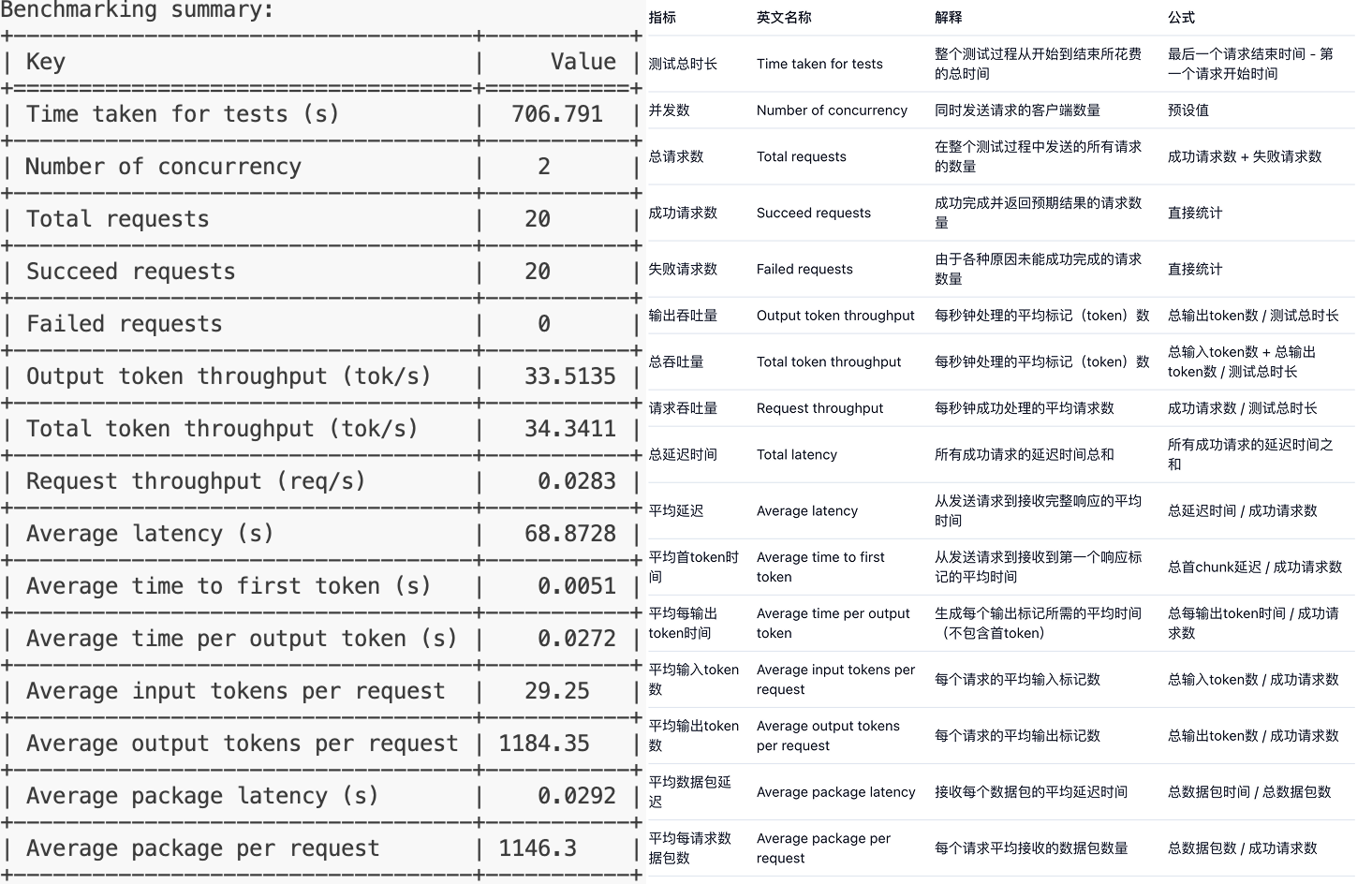 表格展示了模型在不同负载下的性能表现,特别是在高负载下的性能瓶颈。模型在处理输入和生成输出时的时间相对稳定,但在高负载下的延迟显著增加,这可能会影响用户体验。因此,可能需要对模型进行优化,或者在部署时考虑增加资源以提高性能。