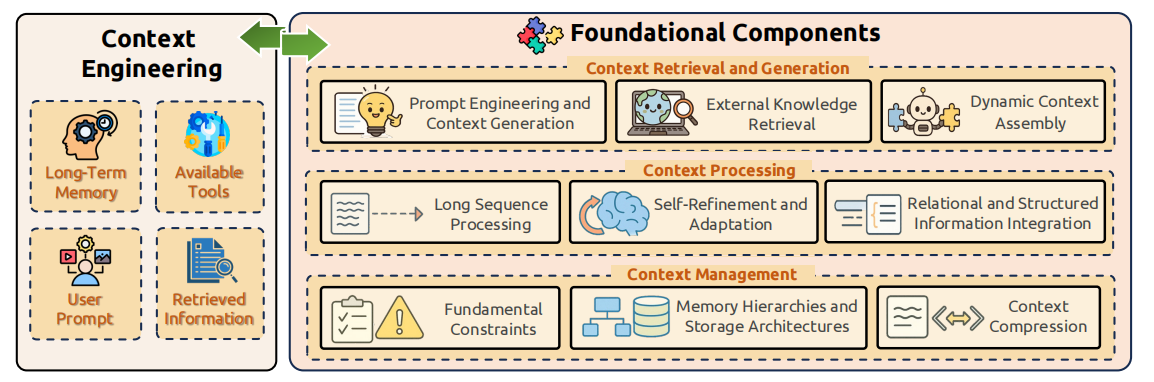 上下文检索与生成(Context Retrieval and Generation):为模型搜集和构建合适的上下文内容上下文处理(Context Processing):优化模型对已获取的上下文信息进行加工、变换和优化上下文管理(Context Management):对上下文进行高效的存储、记忆和优化