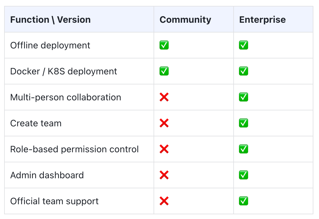 The Community Edition is intended for individual use and does not include advanced features such as multi-user collaboration, team creation, permission control, or management dashboards. These limitations make it difficult to meet the experiment tracking and collaboration needs of AI labs, algorithm teams, and AI-driven enterprises.