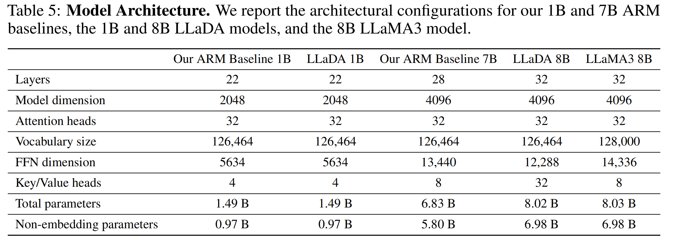 LLaDA 的损失函数是一个变分下界,它优化的是数据似然的近似,这个损失是在所有掩码比例上的期望,因此模型必须学习如何在不同掩码程度下预测被掩码的token,这与扩散模型的最大似然训练一致。对于预训练模型的参数设置,论文中给出了明确的参数配置,当然也可以在模型的config.json中查看,我们看下论文中的结果即可: