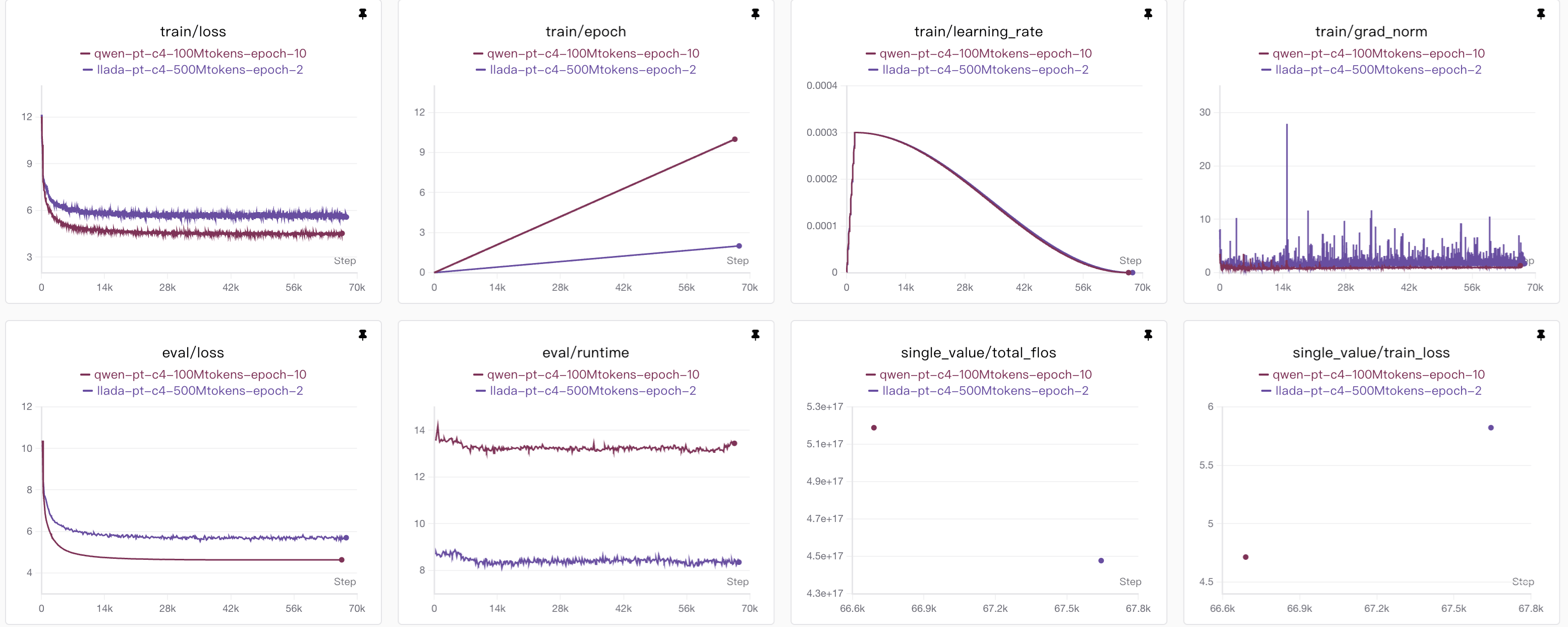 bash scripts/train-qwen-pt-multinpu.sh需要注意的是,由于Qwen和llada结构不一致,因此在设计100M参数量的时候可能会稍微有点区别,因此这里给出我的config.json文件的参数设置: