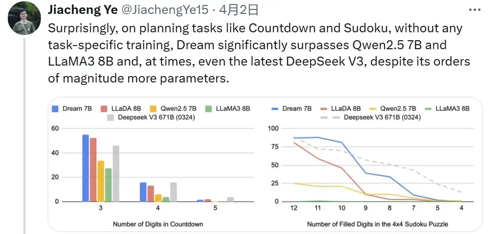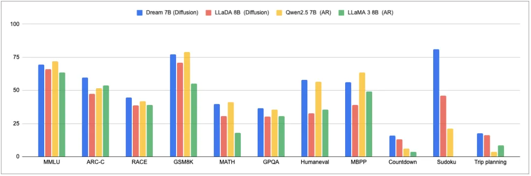 在通用能力、数学推理和编程任务上,这个模型展现出了与同等规模顶尖自回归模型(Qwen2.5 7B、LLaMA3 8B)相媲美的卓越性能,在某些情况下甚至优于最新的 Deepseek V3 671B(0324)。