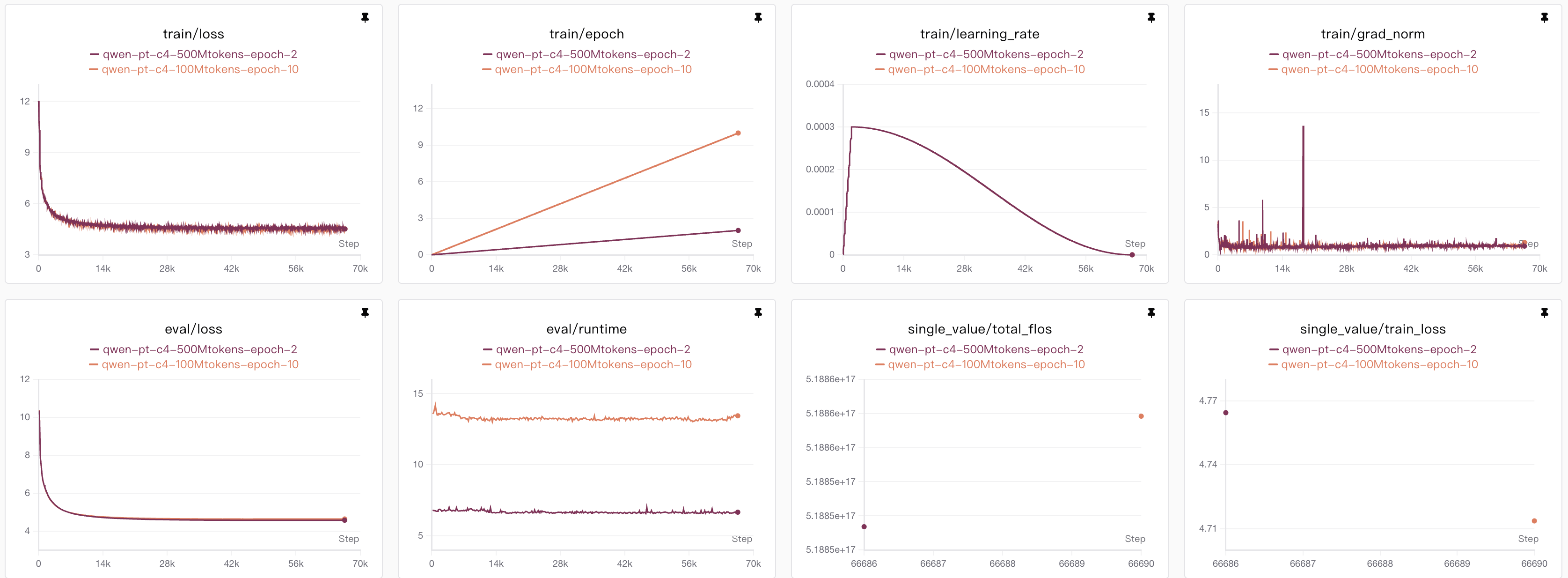 其中epoch=2的时候,我使用了前100万条数据,通过计算得知,每条数据平均有大约500 tokens左右,因此总共的计算量应该有500M tokens;