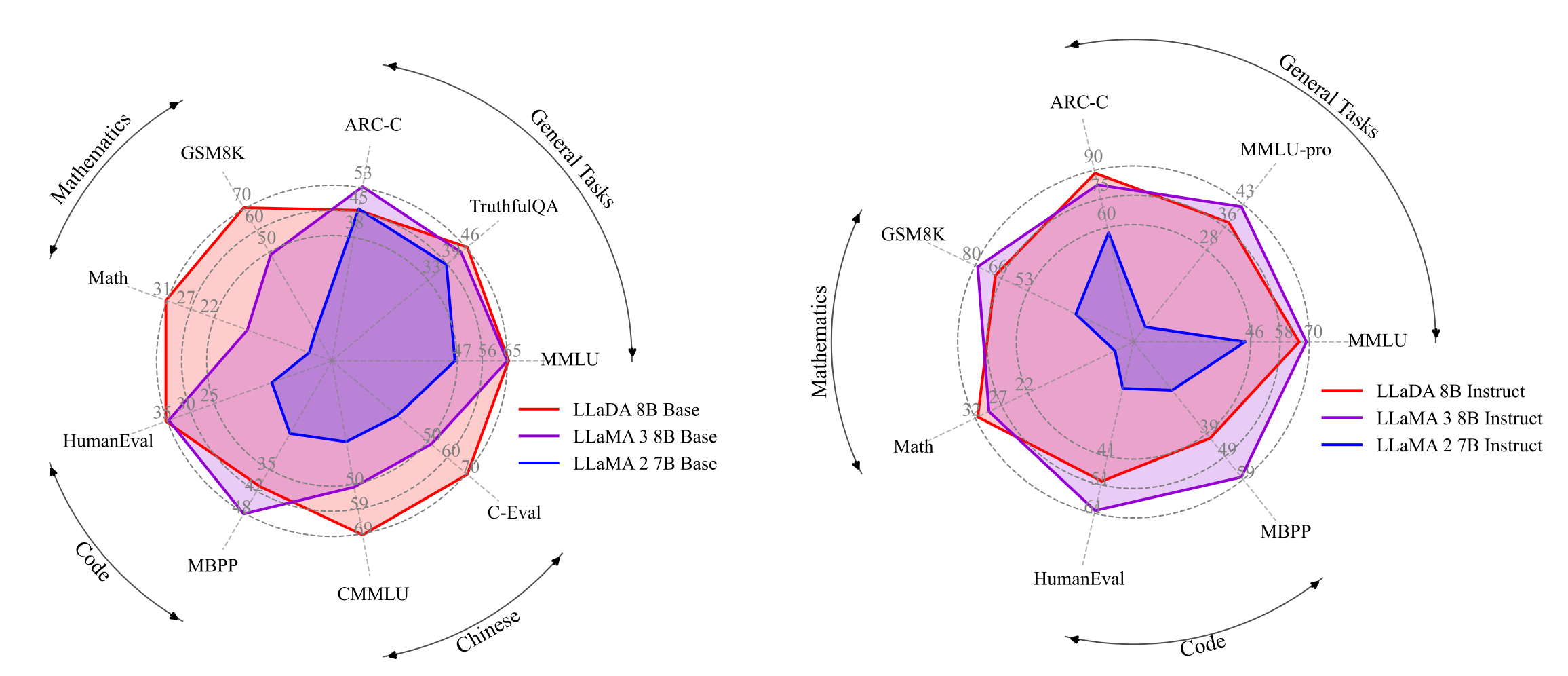 而LLaDA是基于扩散模型的双向模型,天然能够更好捕捉文本的双向依赖关系。