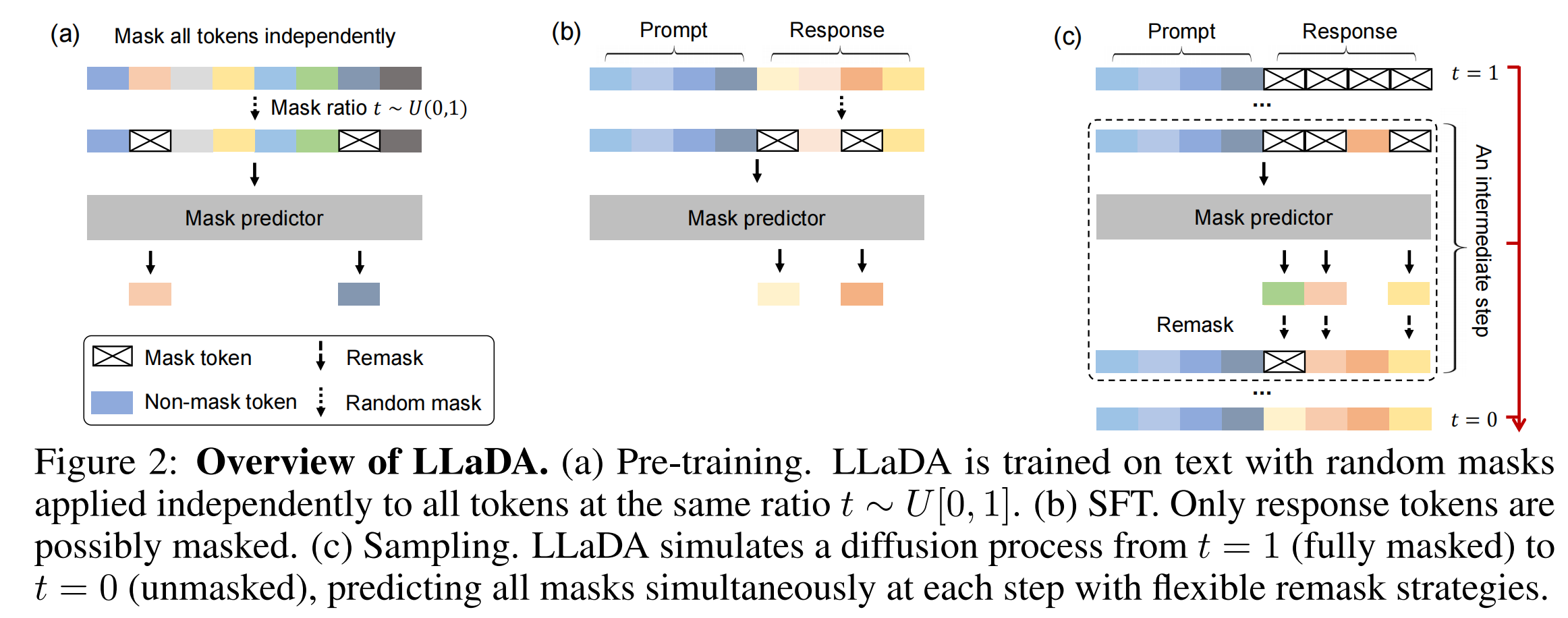 和图像领域的扩散模型相似,LLaDA在训练过程中也是反向加噪以及正向去噪的过程,不过有所区别的是,LLaDA无论是预训练还是微调,加噪过程都是一次性完成的,而且和图像加噪不同,LLaDA是针对tokens来进行随机加噪,或者说覆盖[MASK]标签,论文中给出的原理图已经很清晰的描述了出来: