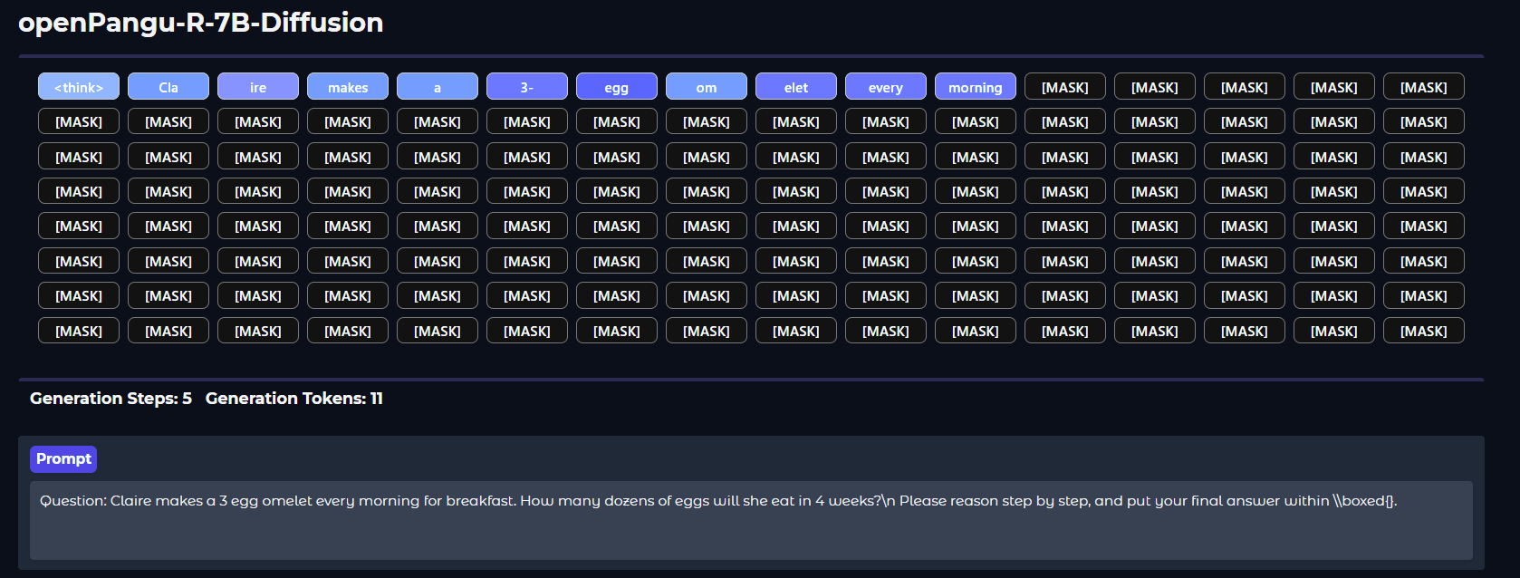 然后最终的推理效果和之前说的动图一样,在生成tokens的时候会不断的消除[MASK],diffusion模型和自回归模型很不一样的地方在于,消除的[MASK]并不一定是按照顺序的,有可能会反复确认并生成: