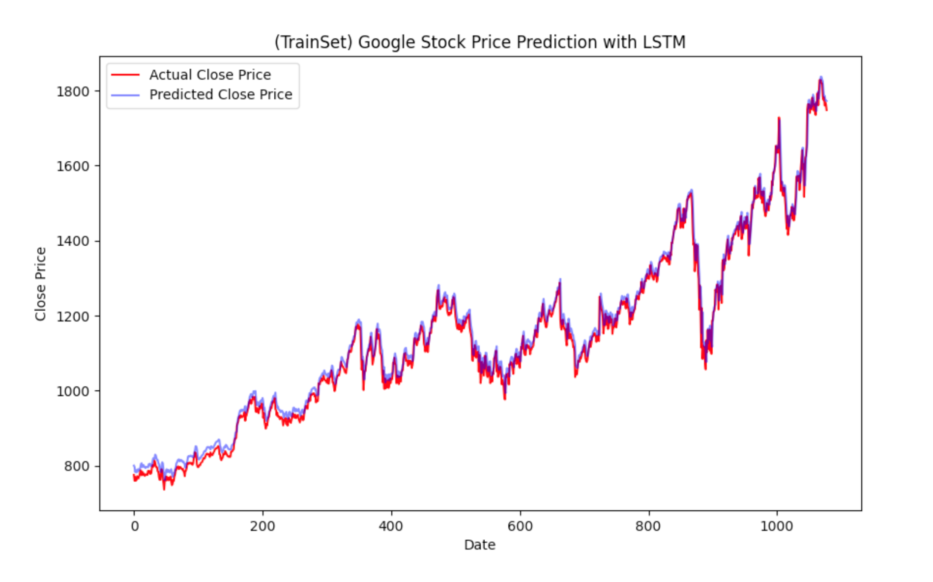 plt_image.append(plot_predictions(new_y_train, train_predictions, '(TrainSet) Google Stock Price Prediction with LSTM'))