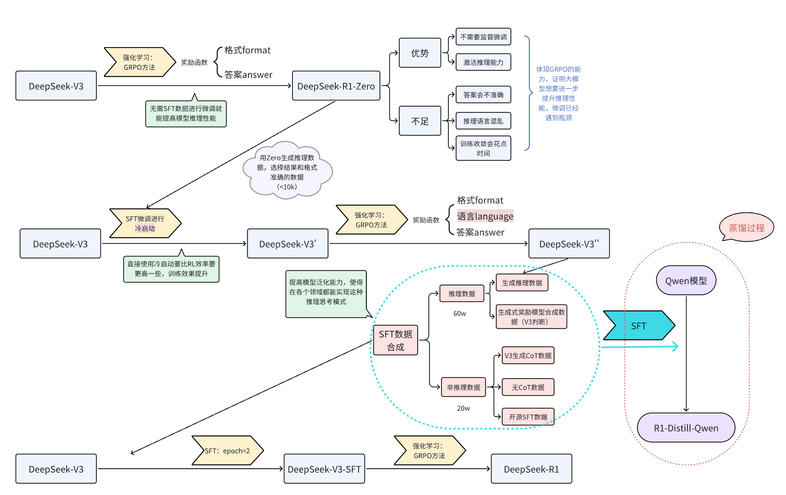 下面是论文里从DeepSeek-V3到DeepSeek-R1的流程图表示