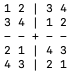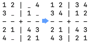 填充4x4数独中的空白位置“_”,按从左到右、从上到下的顺序输出所有“_”对应的数字列表,数字的数量要和“_”的数量一致。