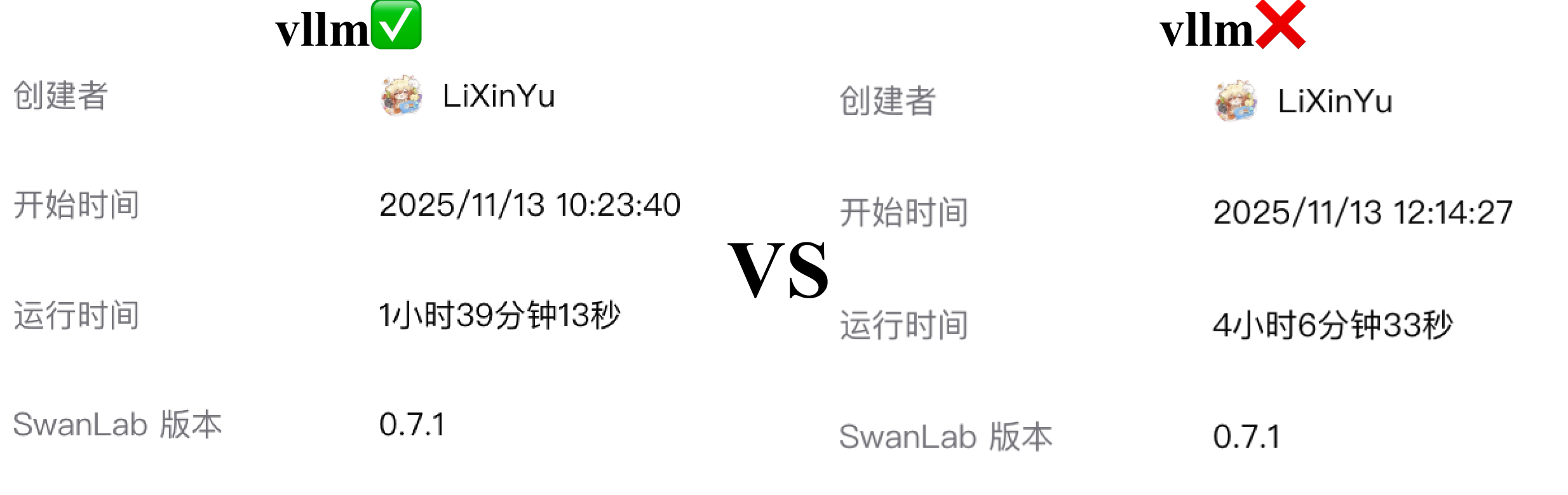 不过vllm确实能极大地提高训练的效率,下面是有无vllm的实验时间的对比图: