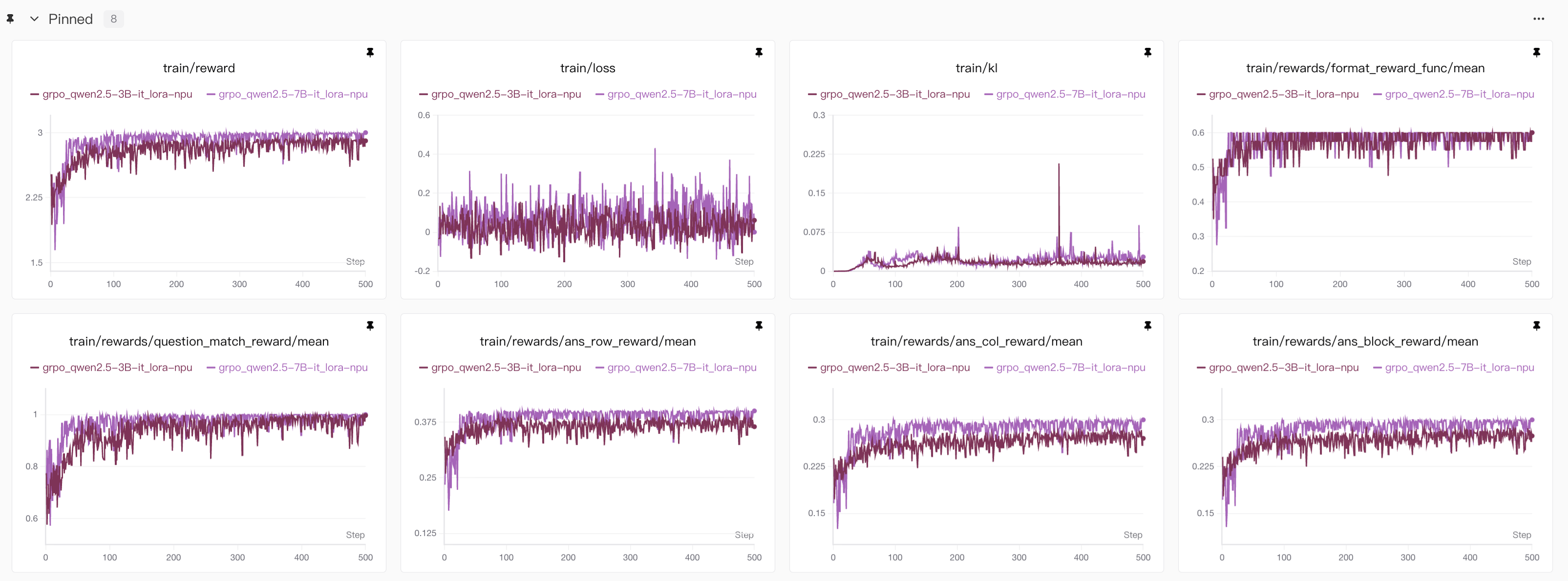 本次实验我们使用GRPO的方法,用lora来做微调,我们分别在GPU、昇腾NPU的AI训练卡上训练,同时我们也对比了3B模型、7B模型的训练效果,并且通过不断地调整参数实现在7B的Qwen模型上数独游戏结果的准确度从原来的41.6%提高到了89.6%。