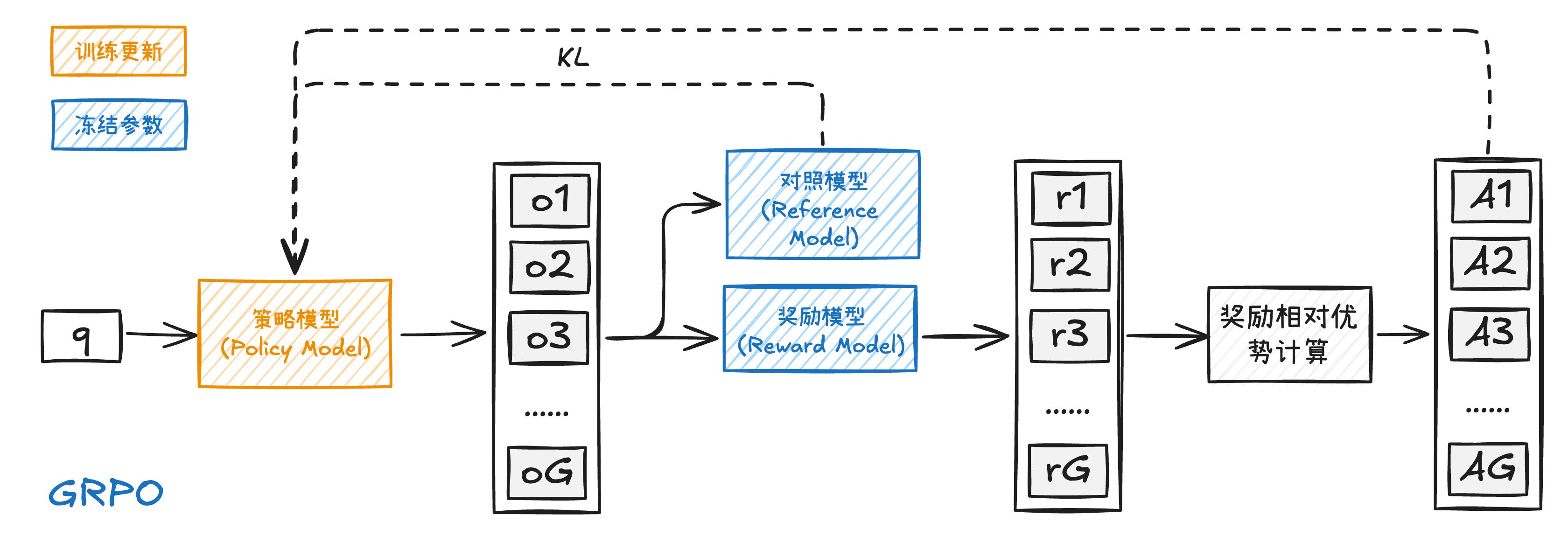 GRPO(Group Relative Policy Optimization,群体相对策略优化)优化了这些问题,GRPO在训练过程中,对于每一个问题q,旧的策略会生成G个输出{o1,o2,...,oG},随后,通过给予规则的奖励机制或者奖励函数对这些输出进行打分,得到对应的多个奖励值{r1,r2,...,rG},然后经过Group Computation计算出每一个奖励对应的优势值{A1,A2,...,AG}