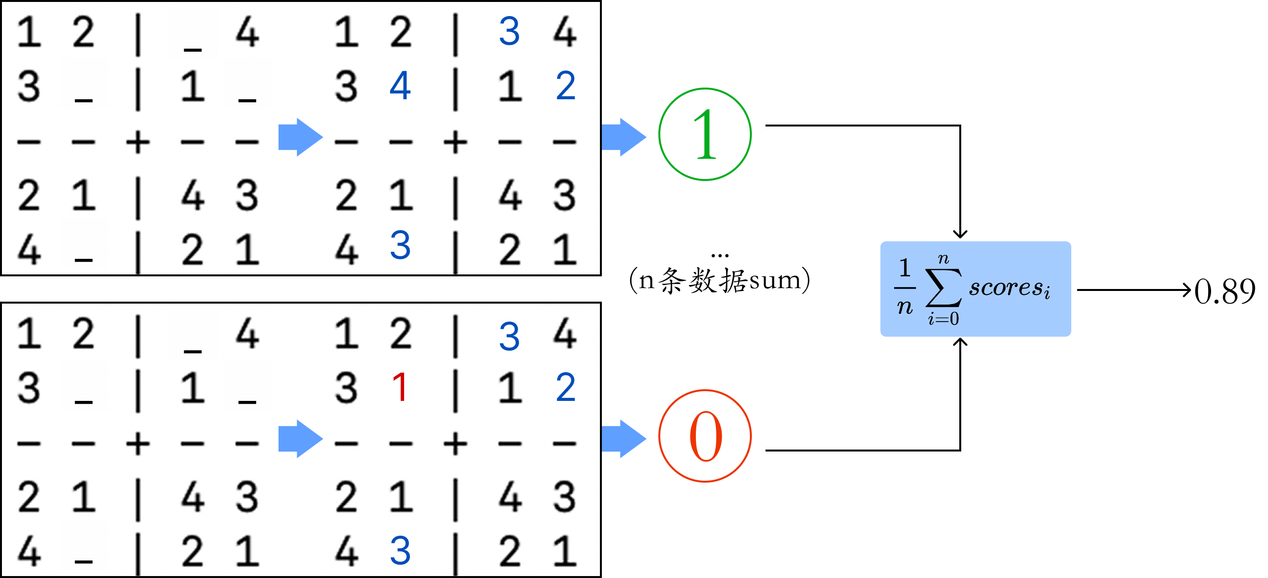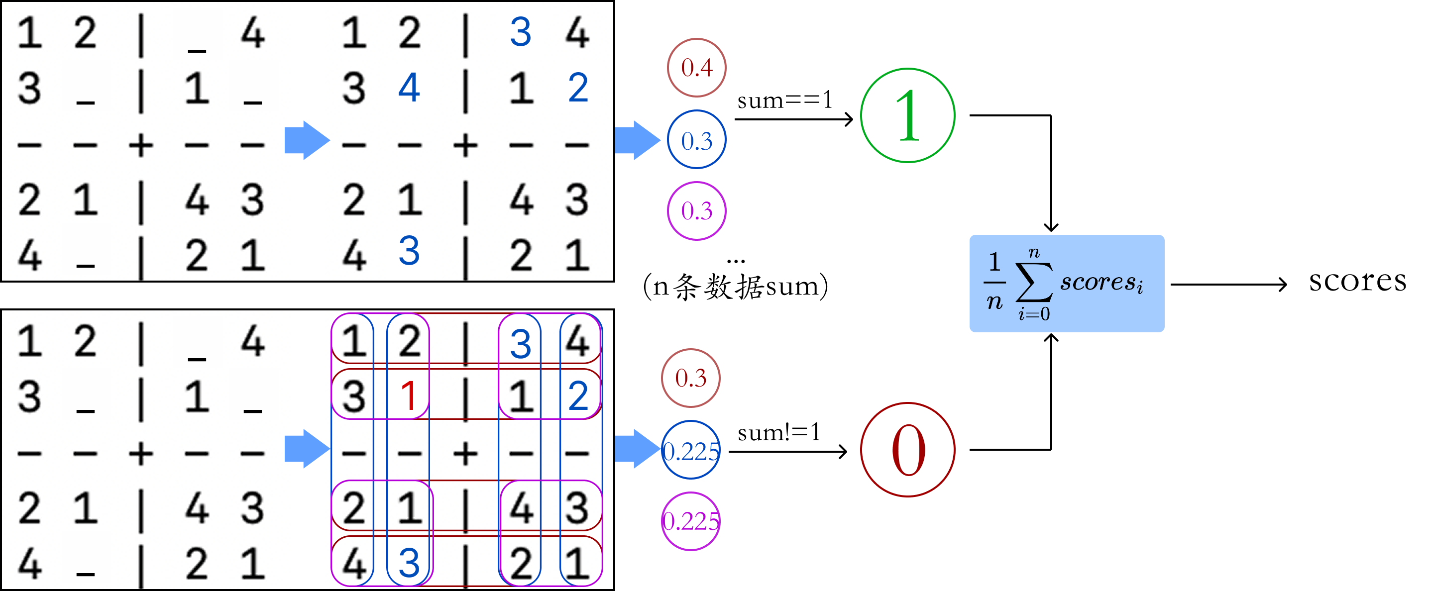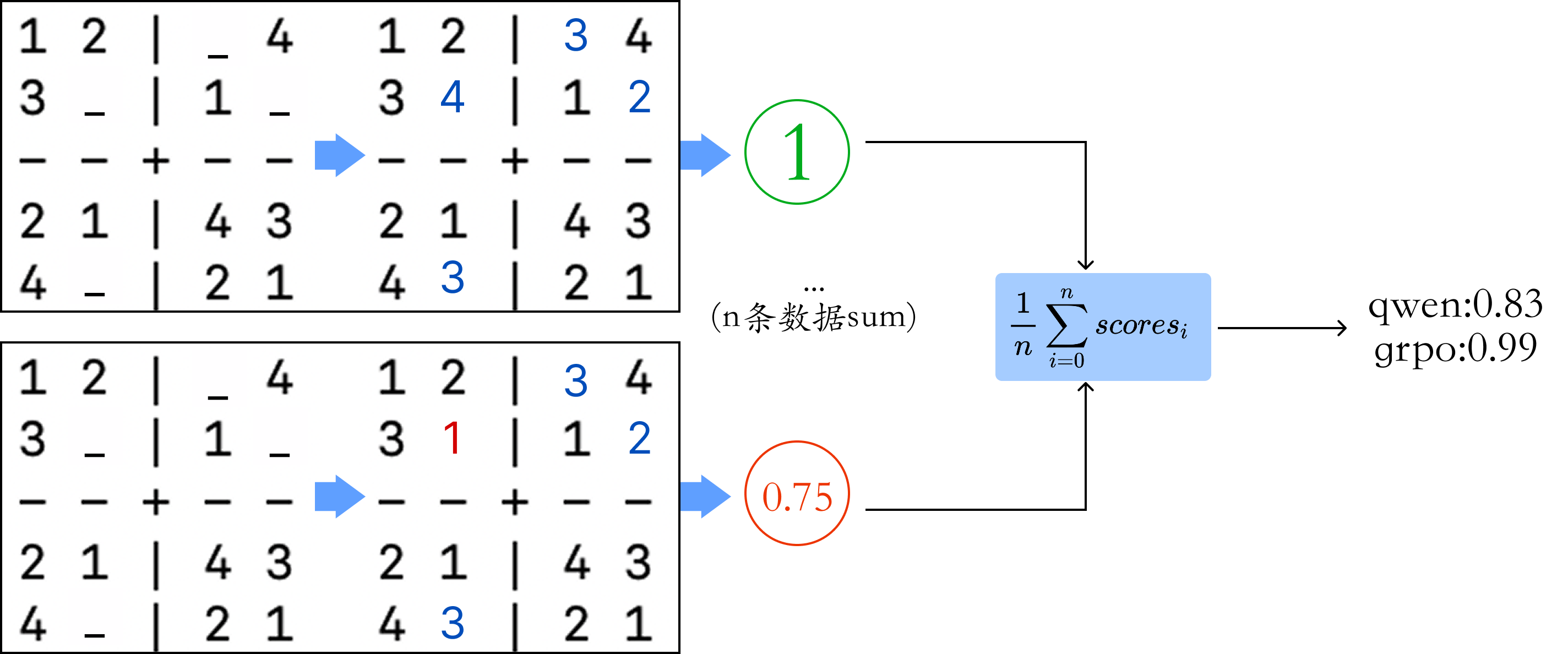 1. 同一个问题可能回答的结果不一样,但可能符合数独游戏规则,因此我们不能以单纯的对错来设计解答的准确度奖励,而应该以规则的遵守程度来设计奖励函数,比如每行、每列、每个小格子是否都遵守了规则,如果没有遵守,错了多少个就扣多少分。