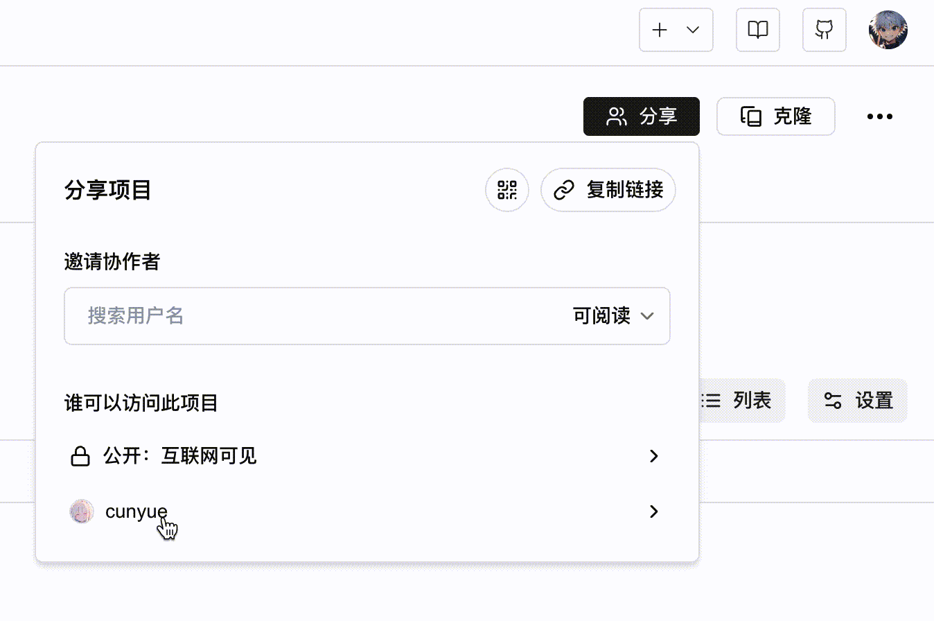 - 在项目的「概览」页,右上角有一个「分享」按钮