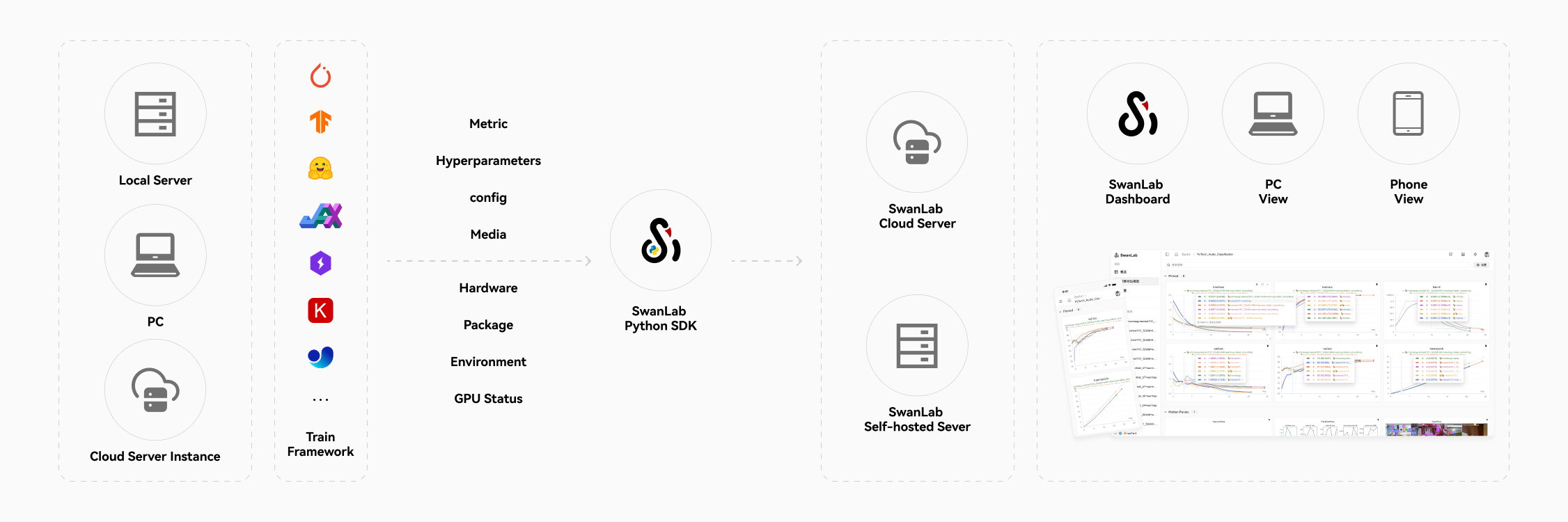 使用SwanLab丰富的实验仪表盘,一站式管理和可视化AI模型训练结果。