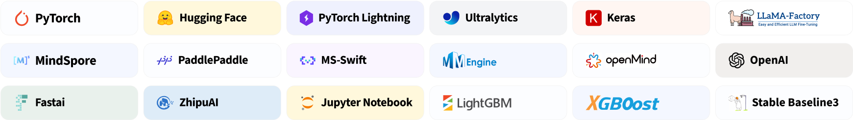 2. ⚡️ 全面的框架集成: PyTorch、🤗HuggingFace Transformers、PyTorch Lightning、🦙LLaMA Factory、MMDetection、Ultralytics、PaddleDetetion、LightGBM、XGBoost、Keras、Tensorboard、Weights&Biases、OpenAI、Swift、XTuner、Stable Baseline3、Hydra 在内的 40+ 框架