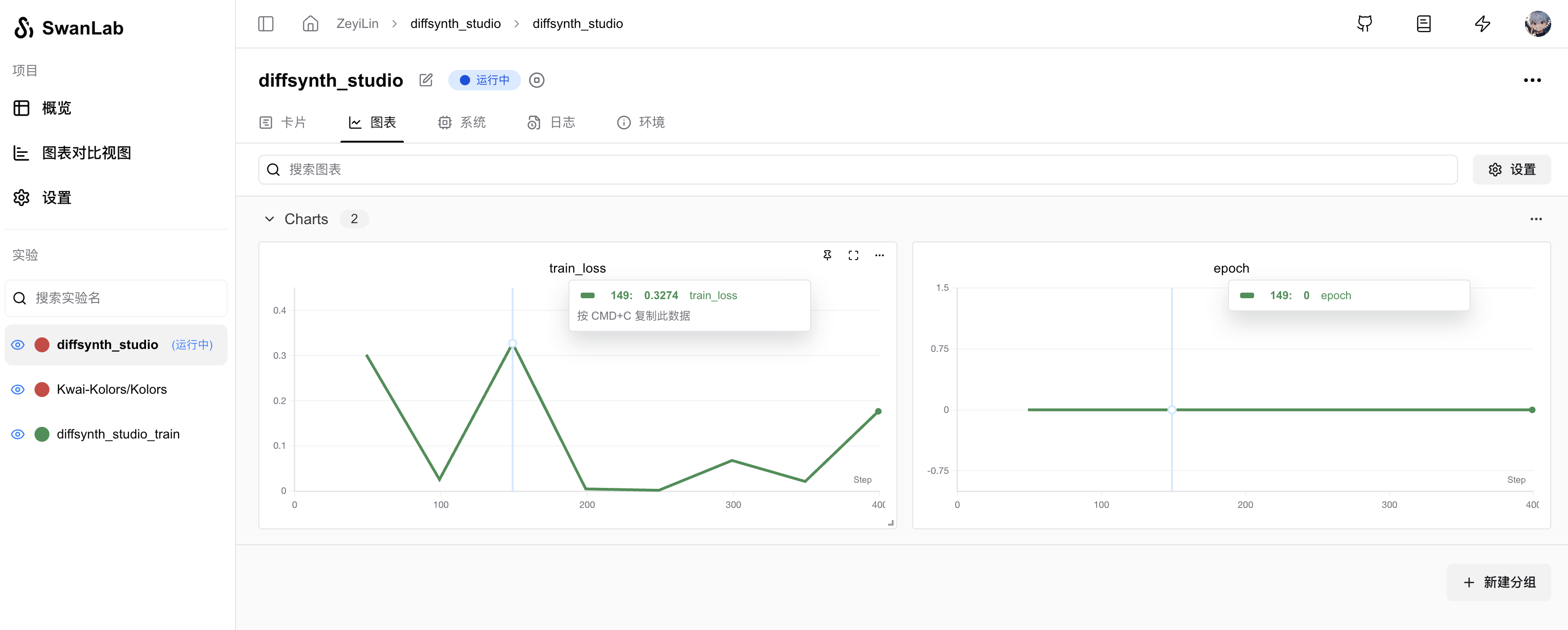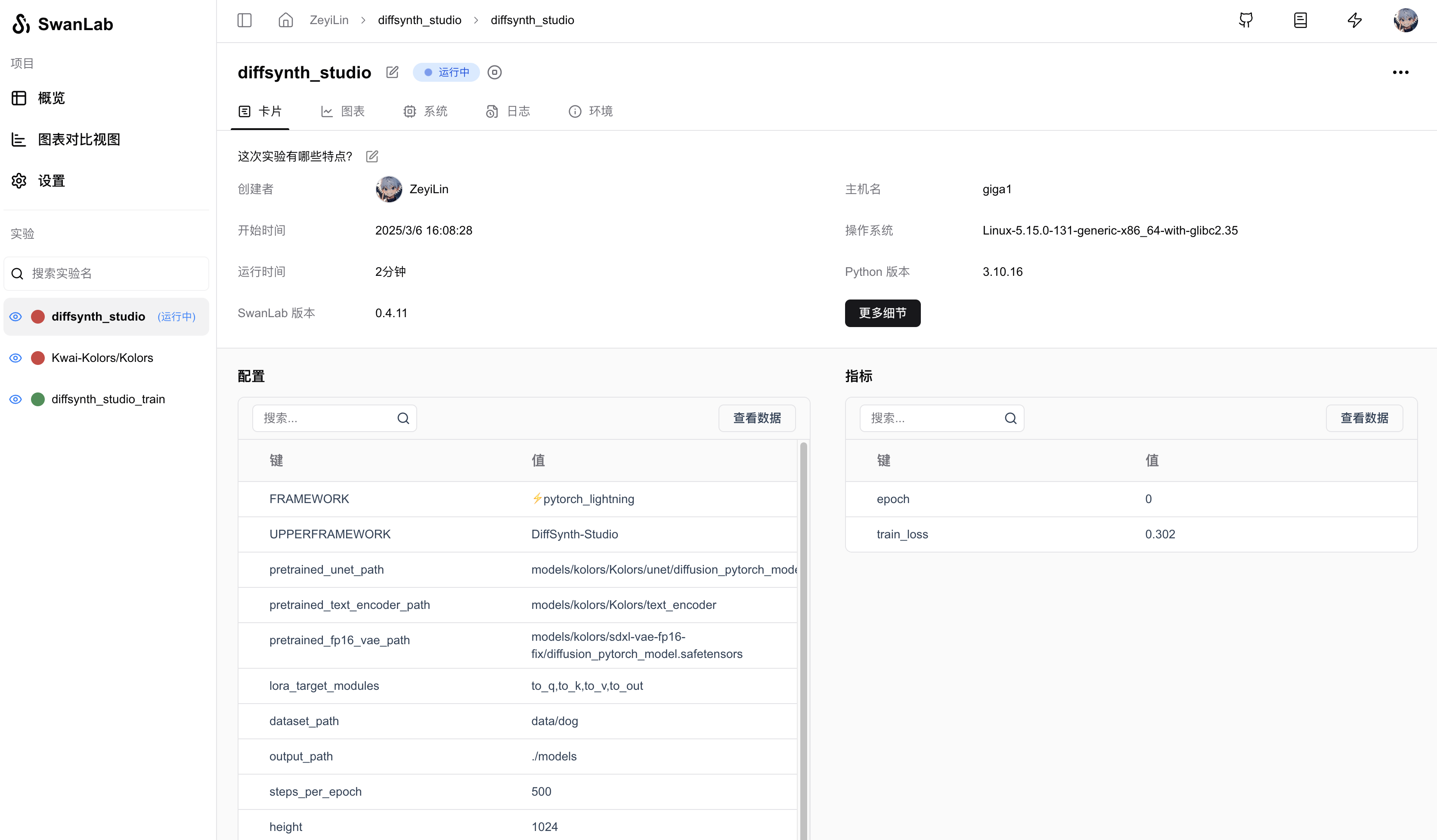 你可以使用DiffSynth Studio快速进行Diffusion模型训练,同时使用SwanLab进行实验跟踪与可视化。