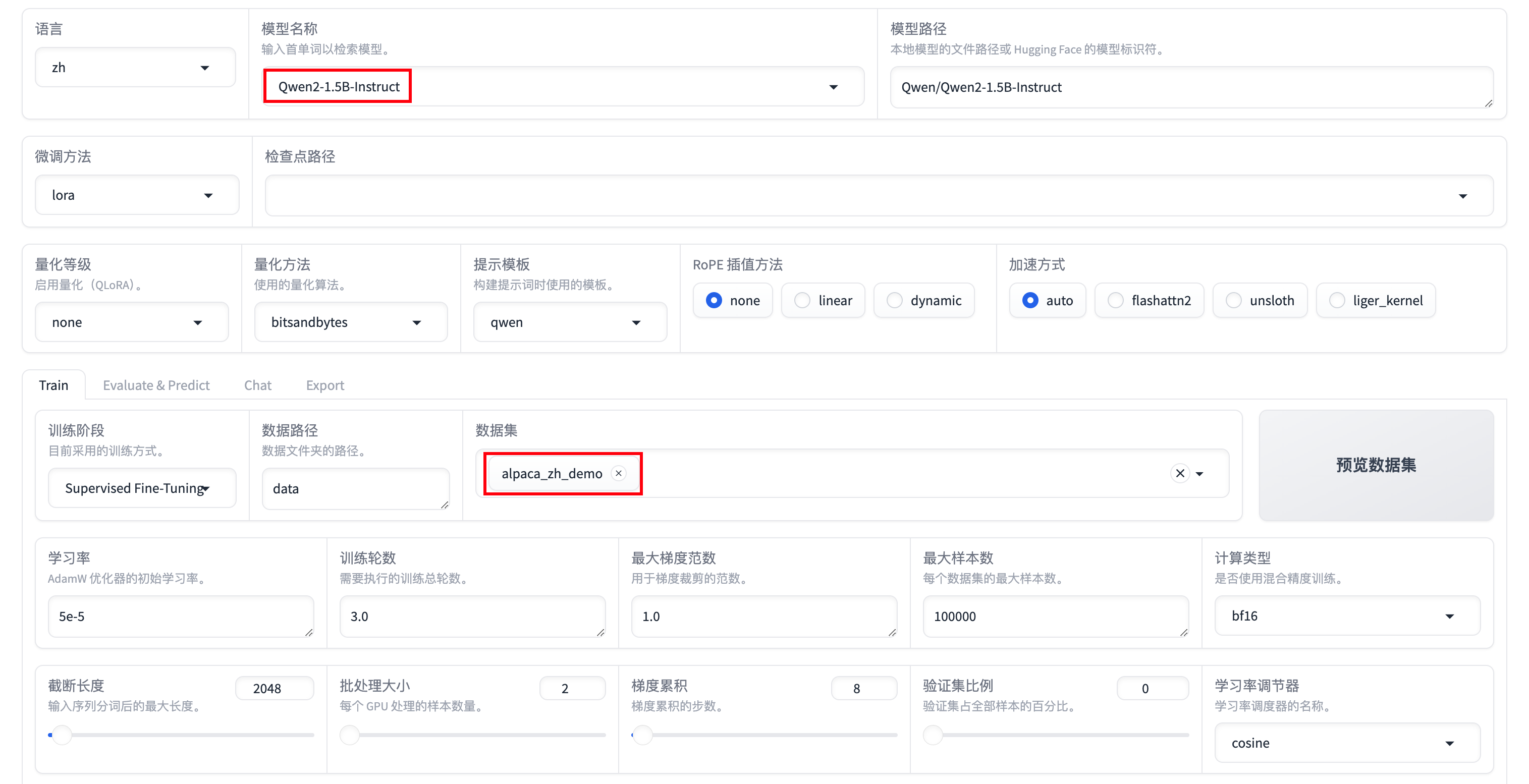 export USE_OPENMIND_HUB=1 # Windows 使用 `set USE_OPENMIND_HUB=1`执行 llamafactory-cli webui 之后,你可以在浏览器看到下面的UI界面。本案例选择Qwen2-1.5B-instruct作为模型,alpaca_zh_demo作为数据集:
