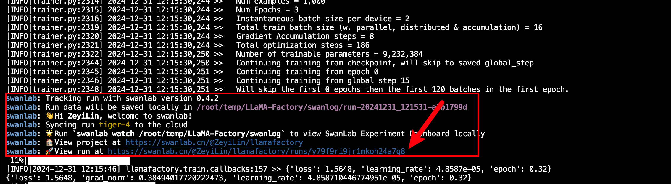 在完成载入模型、载入数据集,正式开启微调后,我们可以在命令行界面找到SwanLab部分: