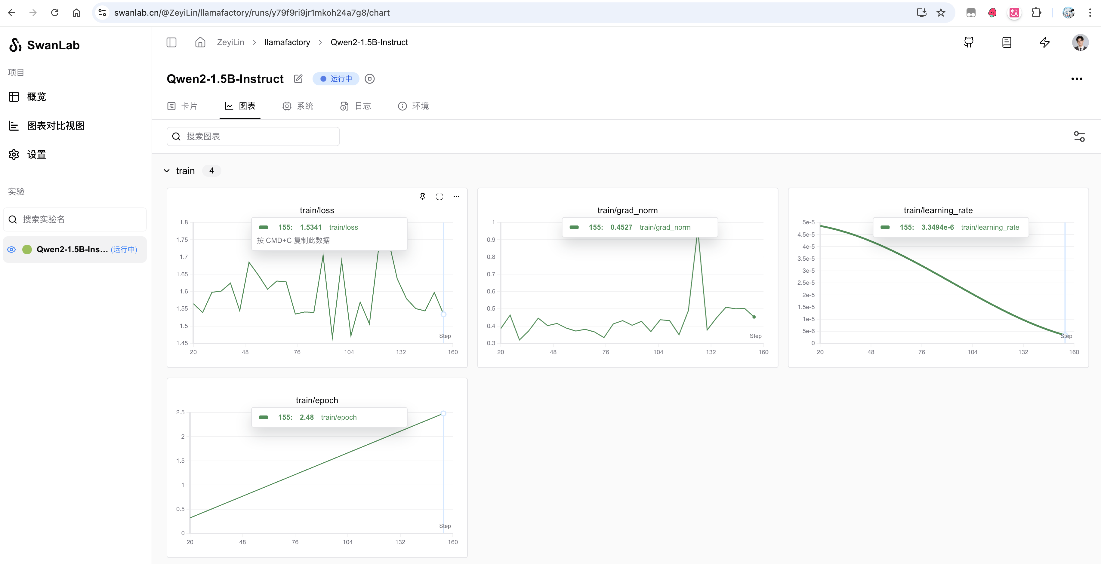 实验过程:https://swanlab.cn/@ZeyiLin/llamafactory/runs/y79f9ri9jr1mkoh24a7g8/chart