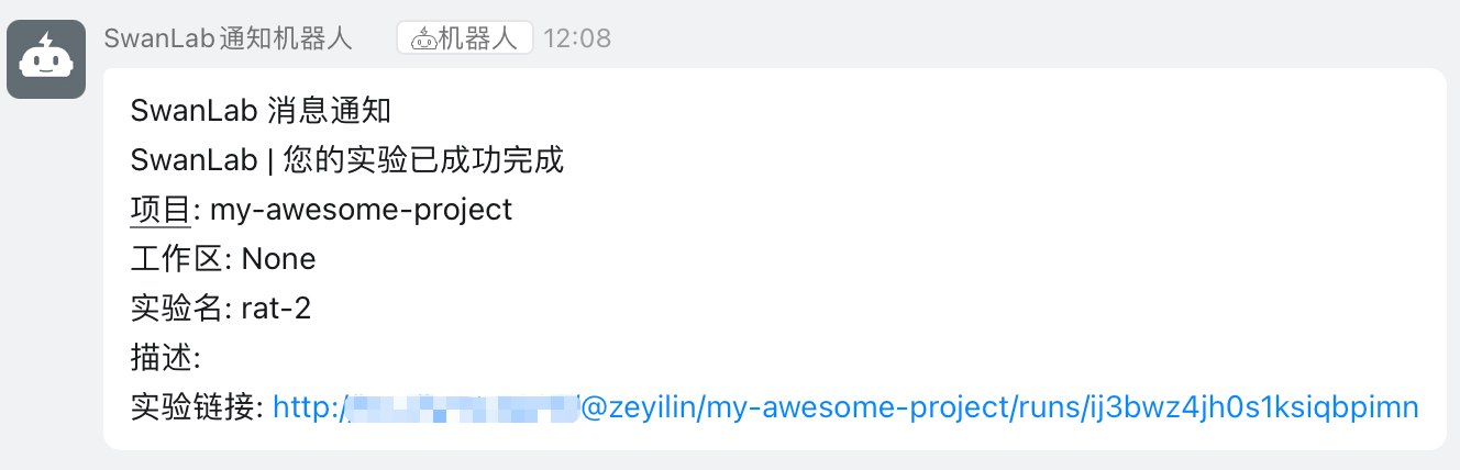 swanlab.init(callbacks=[dingtalk_callback])这样,当训练完成/发生错误时(触发swanlab.finish()),你将会收到钉钉信息通知。