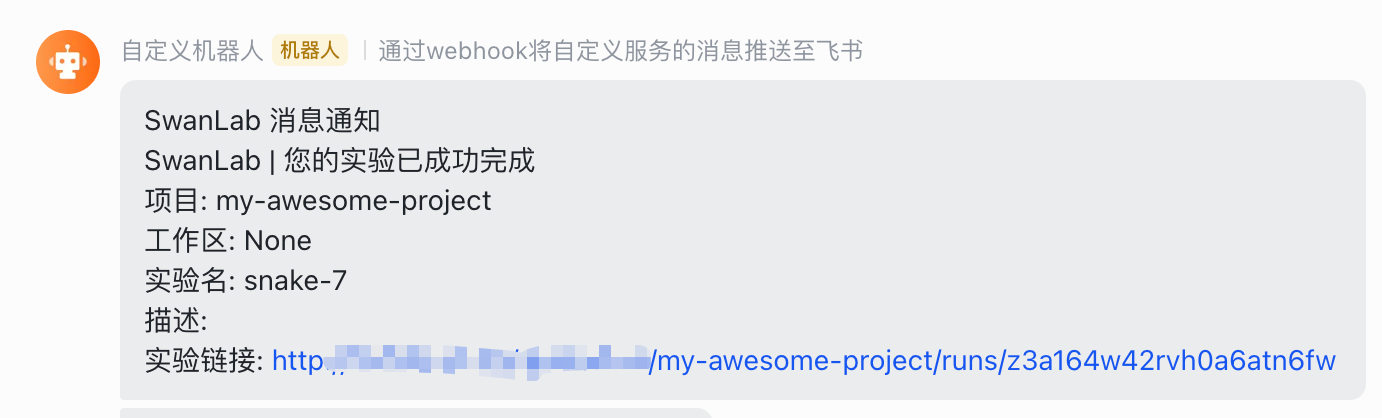 这样,当训练完成/发生错误时(触发swanlab.finish()),你将会收到飞书信息通知。