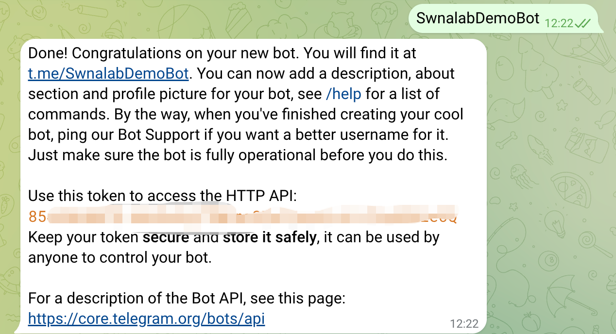 完成创建后收到消息如下,复制并保存 token